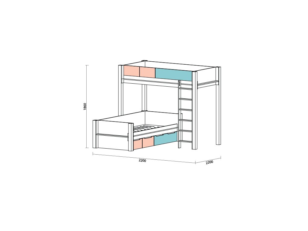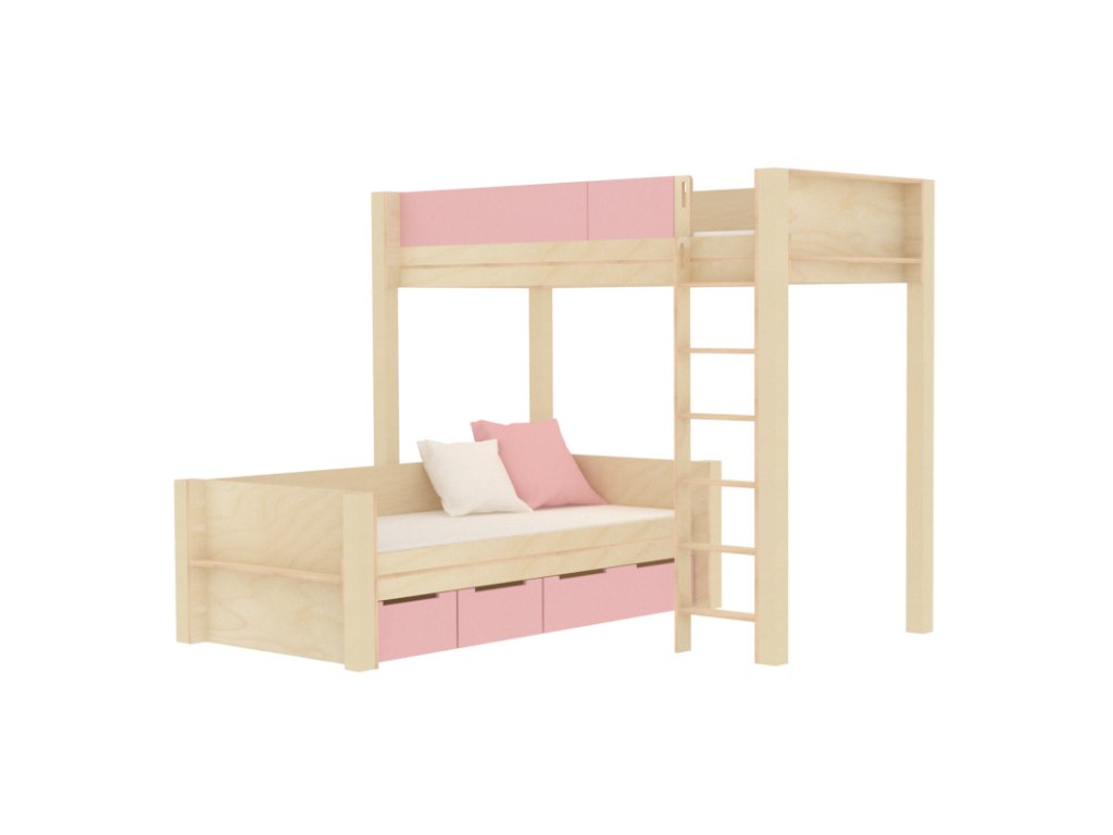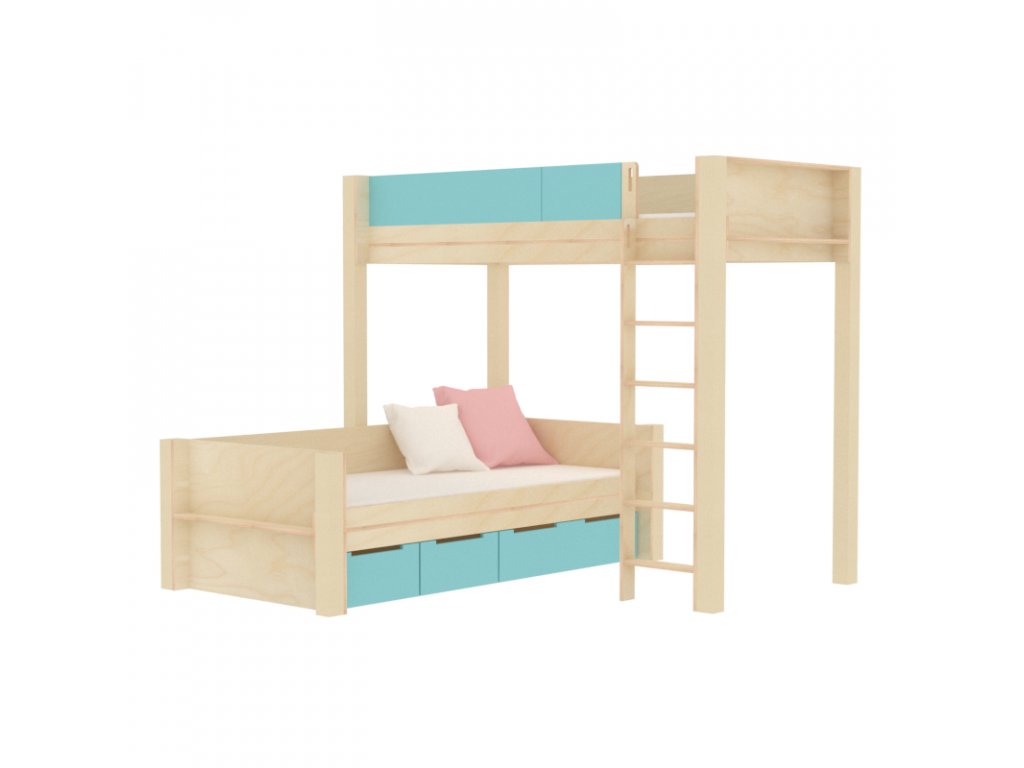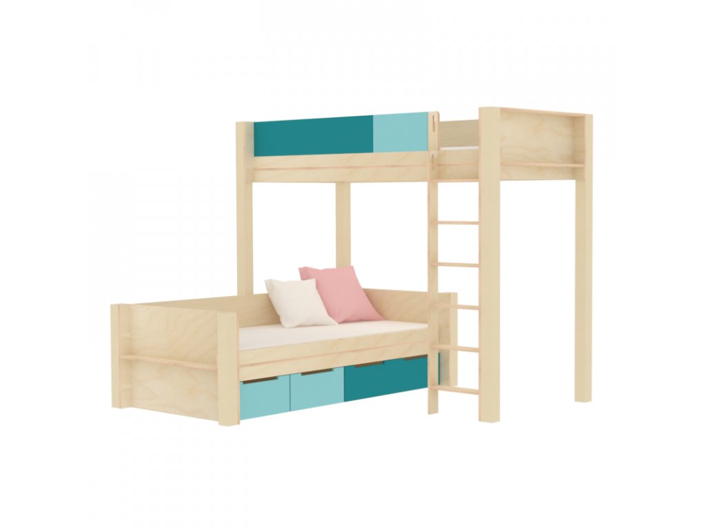 Víme, jak dokáže být dětský nábytek namáhaný a proto jej vyrábíme z kvalitní březové překližky a ručně stříkaných MDF desek v truhlářské dílně v Čechách. Všechny materiály jsou certifikovány jako zdravotně nezávadné. Hrany nábytku jsou zaoblené a žádné úchyty nezasahují do prostoru. Vhodné pro matraci 200 x 90 cm.